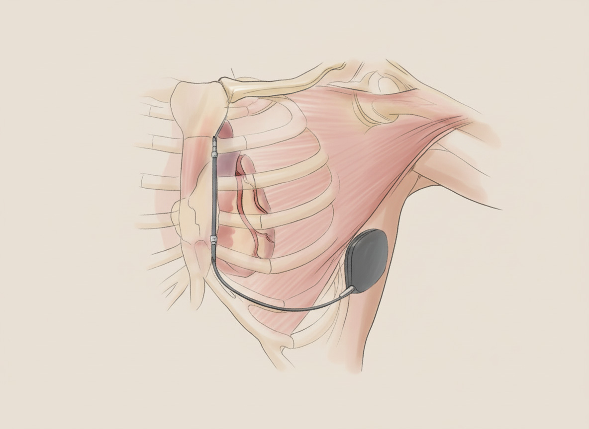 Elektroda je vedena v podkoží podél hrudní kosti – u novějších typů může být umístěna přímo pod hrudní kostí.